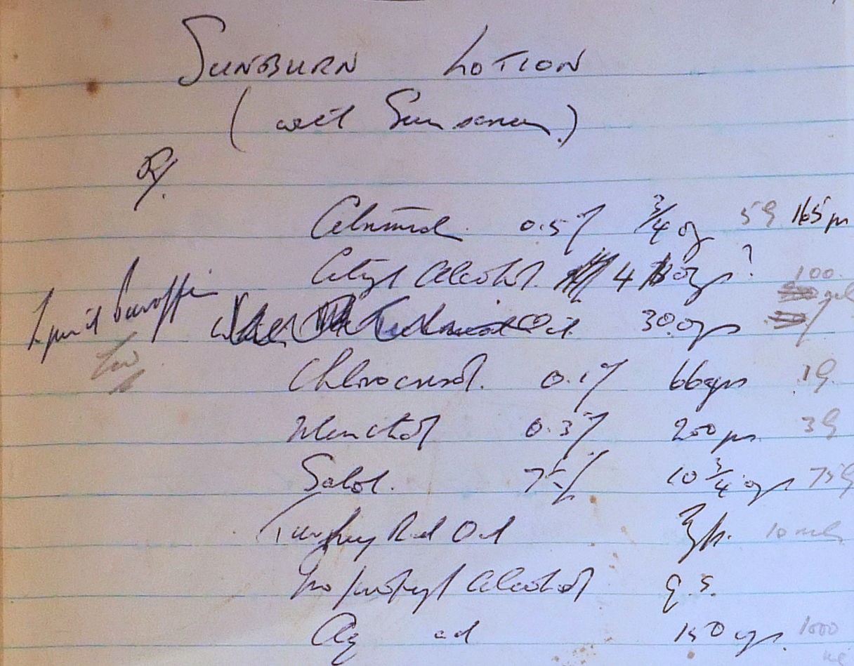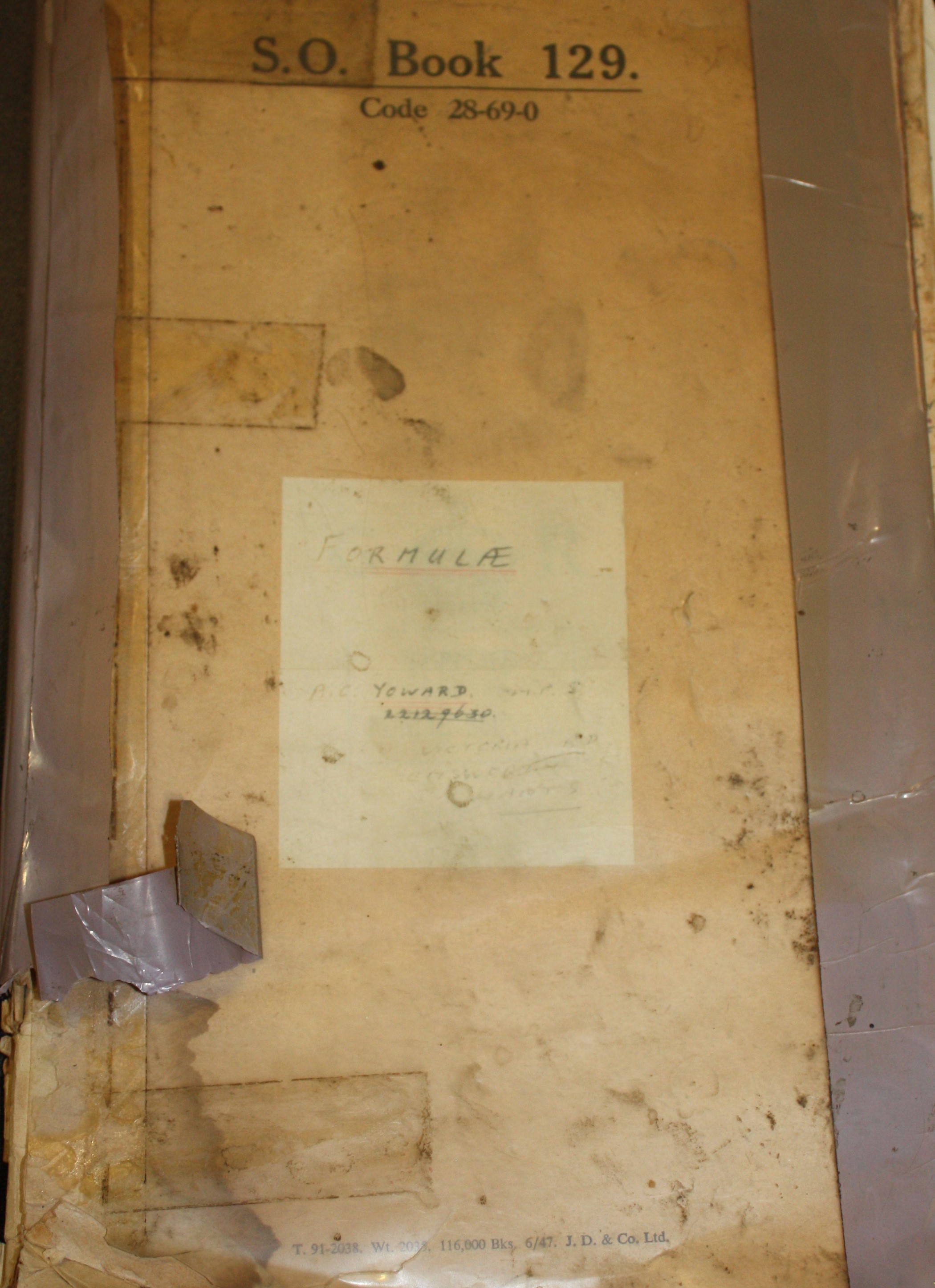 Chemists Book of various concoctions, linctuses, ointments, powders, sprays and creams. Hand-written in ink. The book is a standard stationery office issue of foolscap size. Inscriptions on the book are : S.O. Book 129 Code 28-69-0. The book is well worn with roughened paper edges and a plastic sheet taped over front and back. Brown tape and sellotape have been used.
