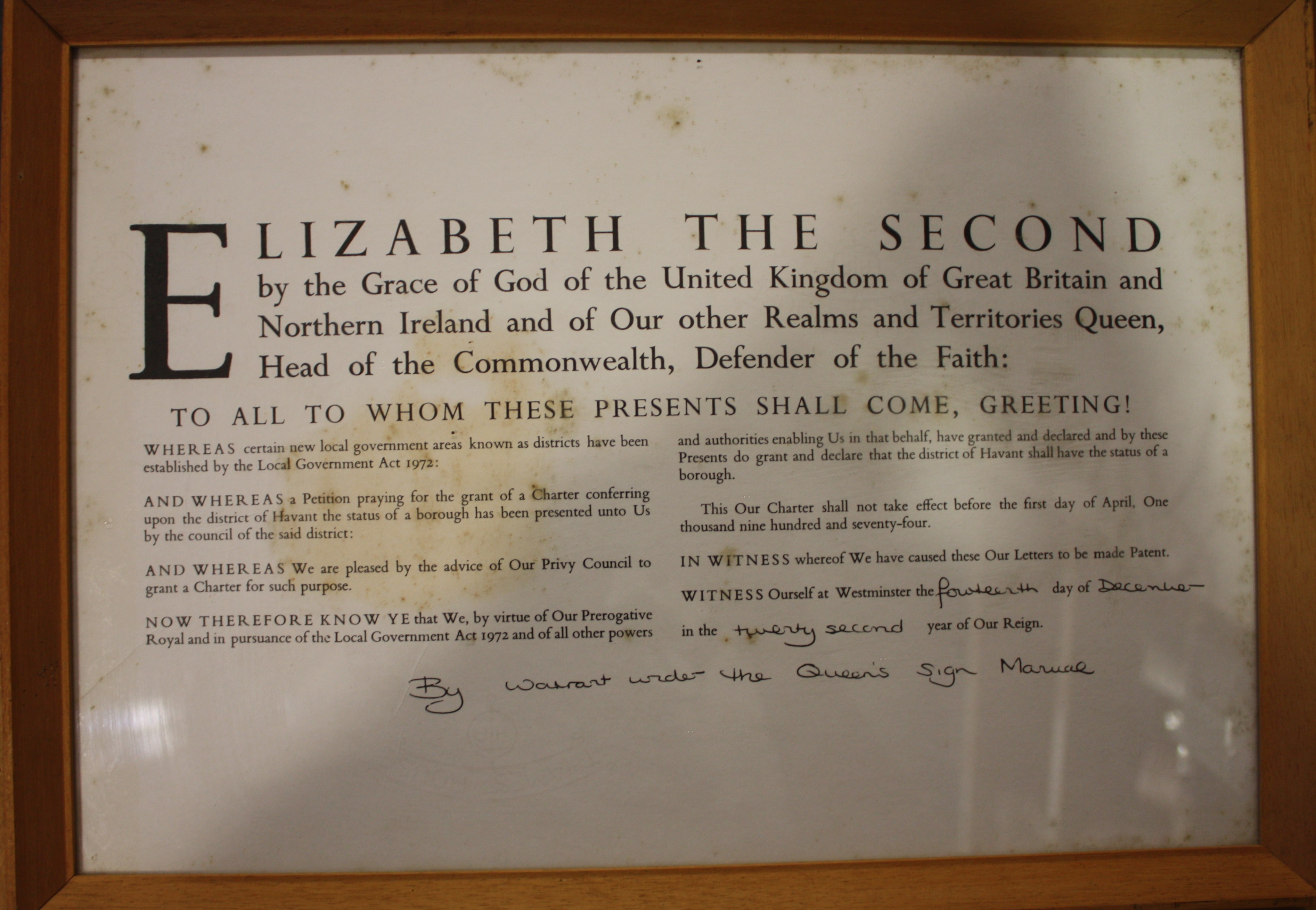 A glazed and framed copy of the Charter conferring the status of Borough upon the district of Havant in Hampshire.