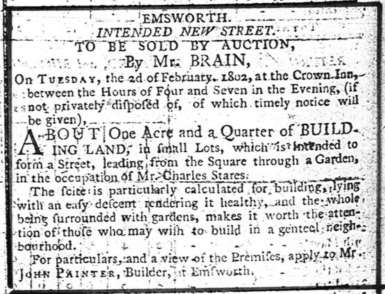 Sale of land by Mr Brain at auction held at The Crown Inn 2nd Feb 1802. The land will become Nile Street. The builder was a Mr. John Painter