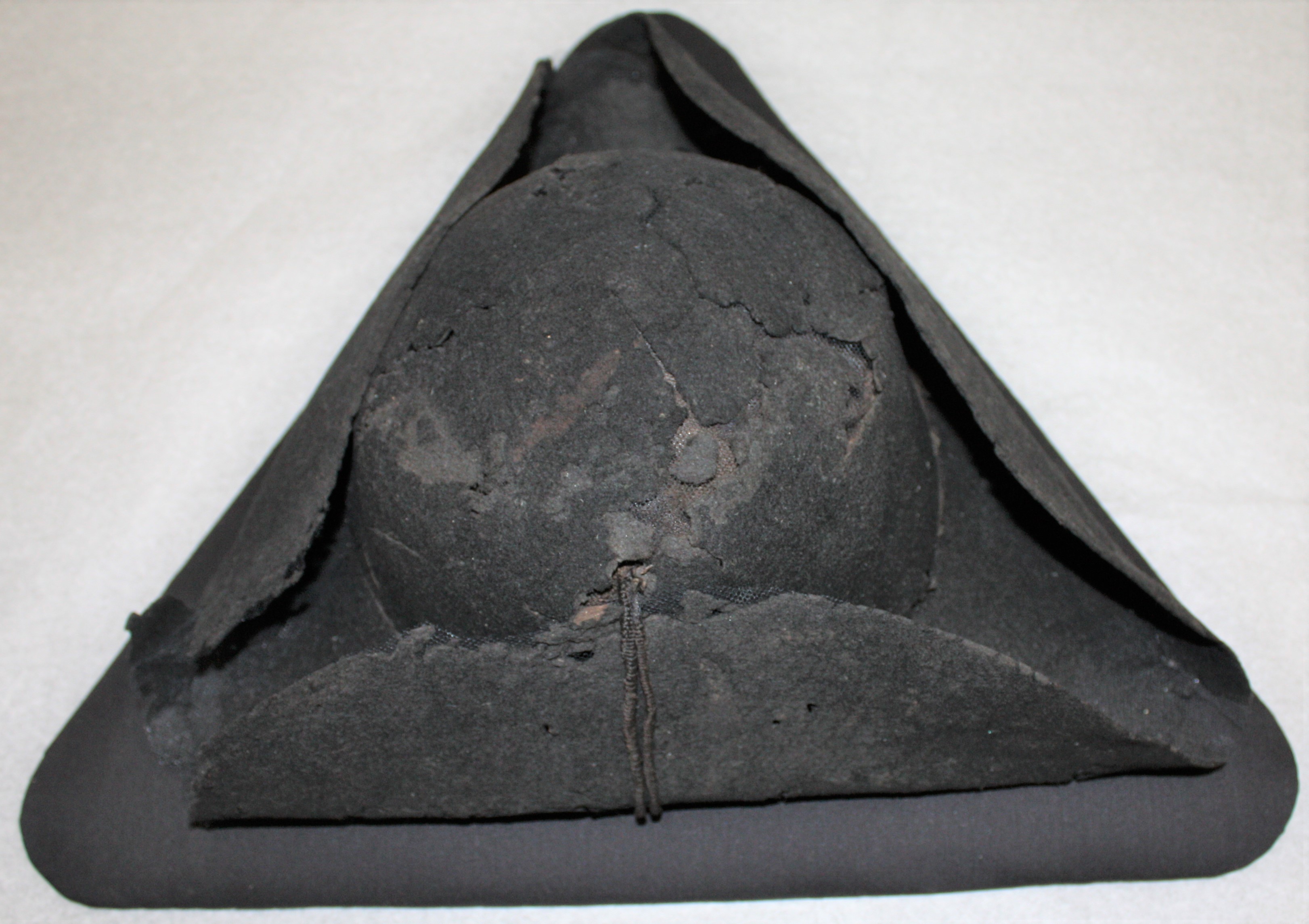 Black tricorn hat believed to date between 1790 and 1810. This hat has deteriorated with missing material although it has more material surviving than EMHT70.2. It was sent for conservation shortly before its entry into the Trust's care and has been stitched onto a base of modern material. The original velvety material has been reinforced with a fine, black plastic mesh. The triangular bases are 40 cm in length and the height of the head cover is 13 cm.