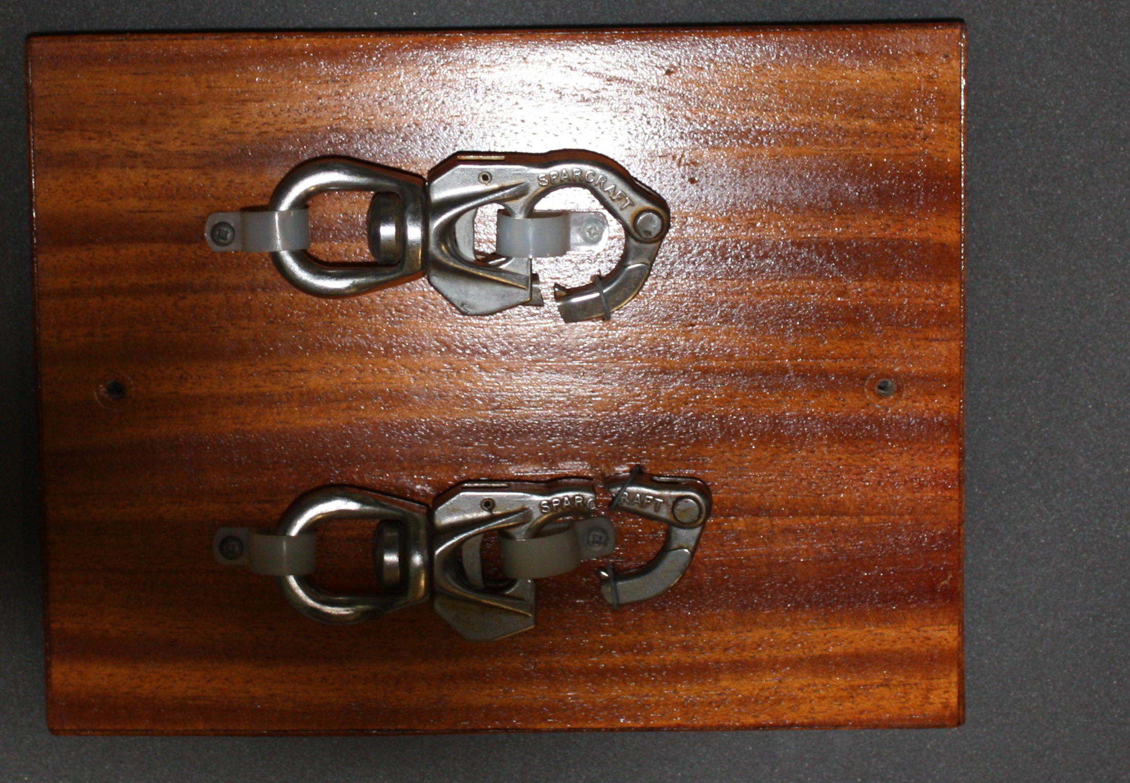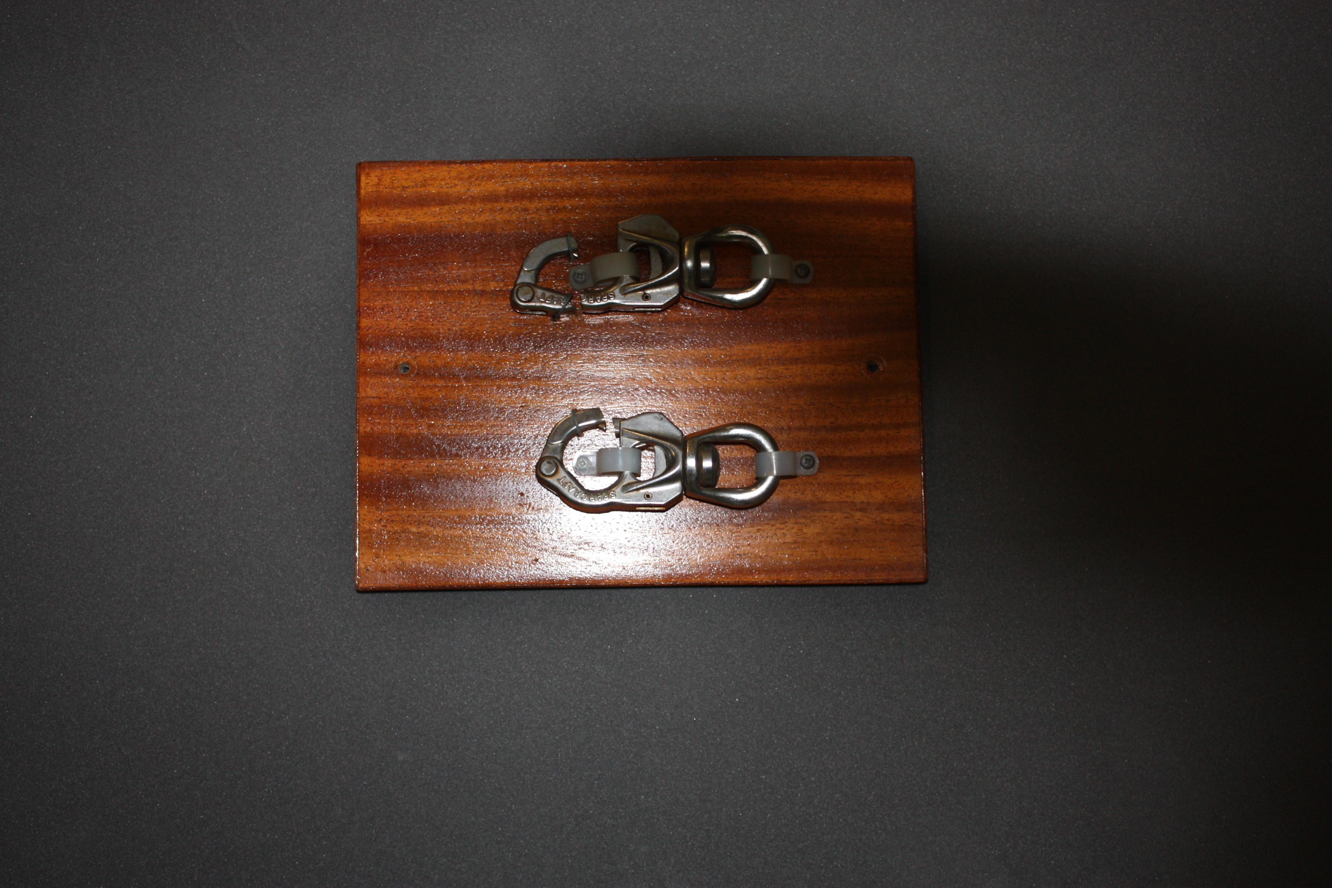 Metal shackle from E.N.Z.A. One of a pair mounted on wooden board. (This shackle is at top). 30cm long x 23cm high x 15cm wide. Sparcraft engraved on metal.