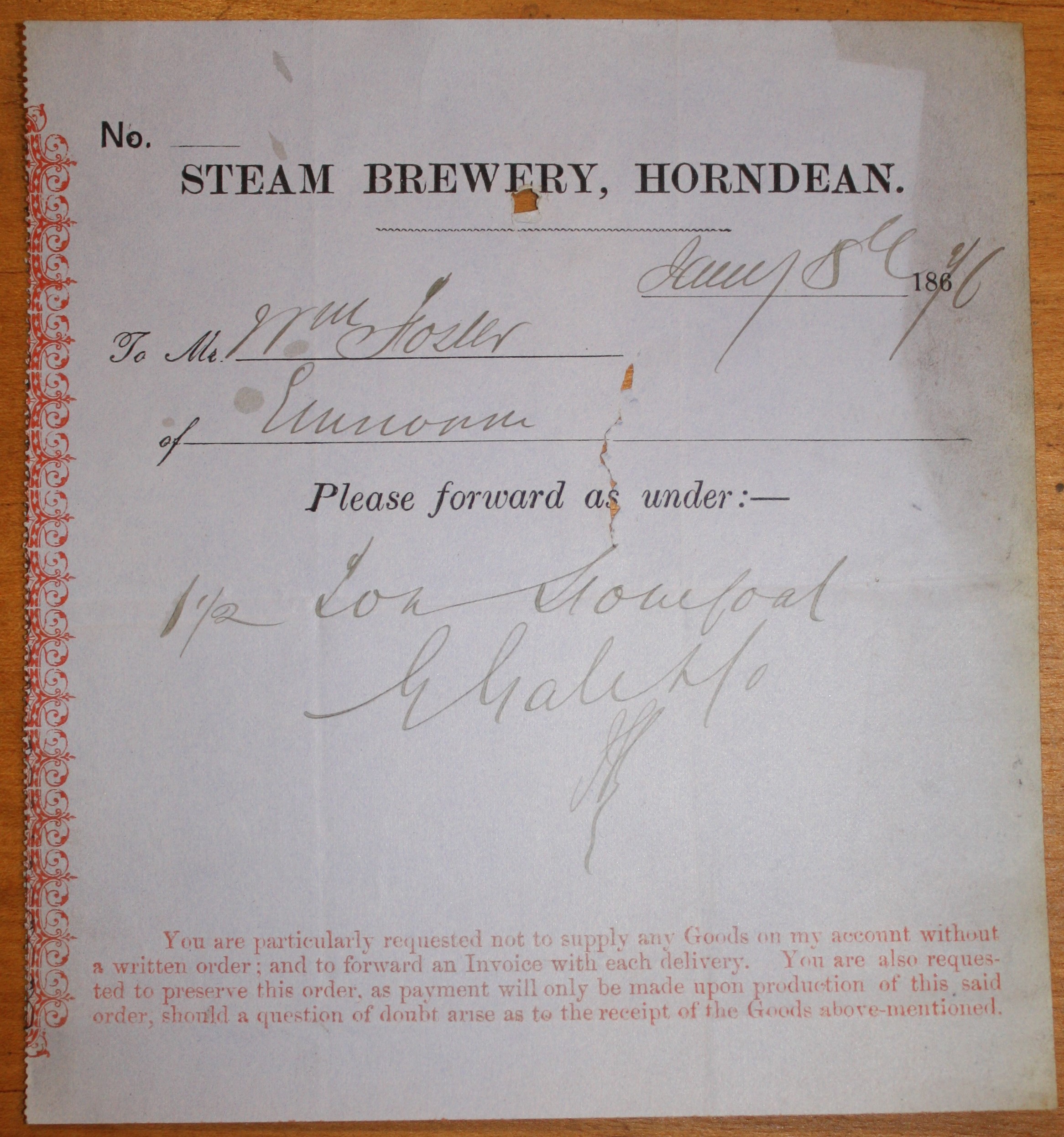 Order for Supplies from the Steam Brewery Horndean.