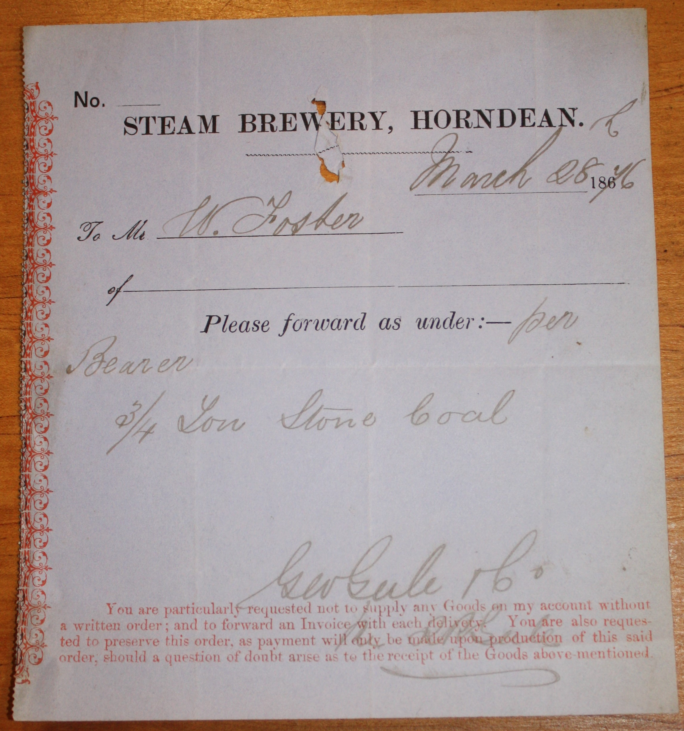 Order for Supplies from the Steam Brewery Horndean.