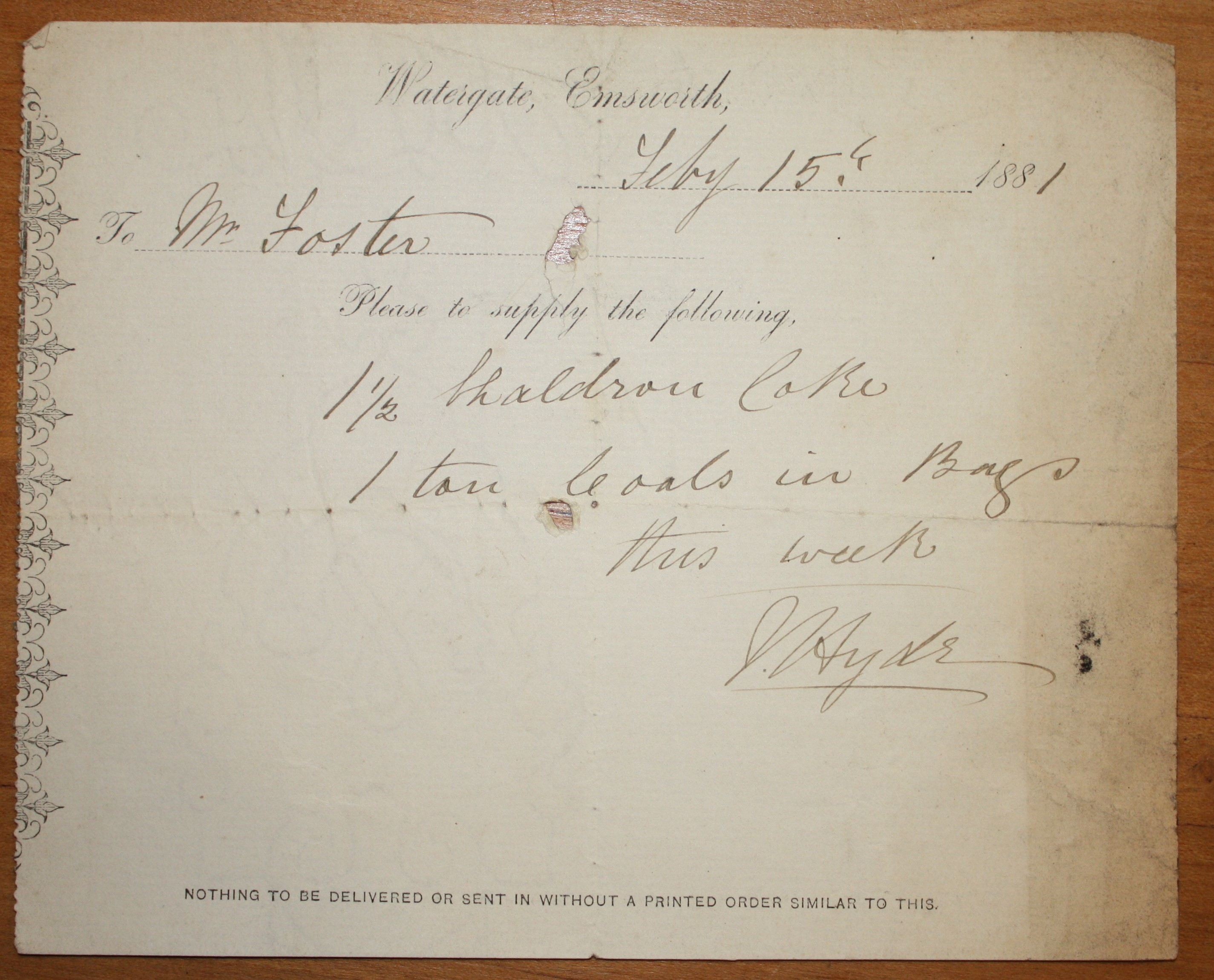 Watergate, Emsworth, “Order for supply to Watergate, Emsworth.,” Emsworth Museum, accessed April 25, 2026, https://emsworthmuseum.org.uk/emcms/items/show/2856.