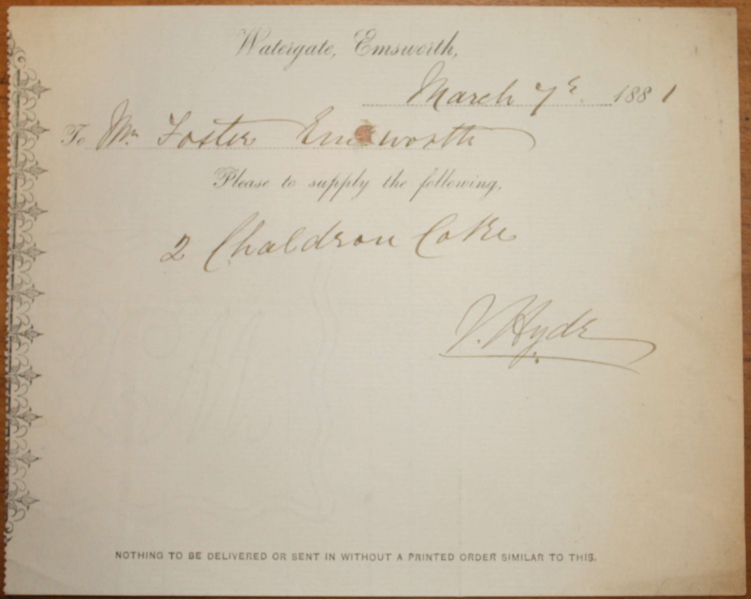 Watergate, Emsworth , “Order for supply to Watergate, Emsworth.,” Emsworth Museum, accessed April 25, 2026, https://emsworthmuseum.org.uk/emcms/items/show/2857.