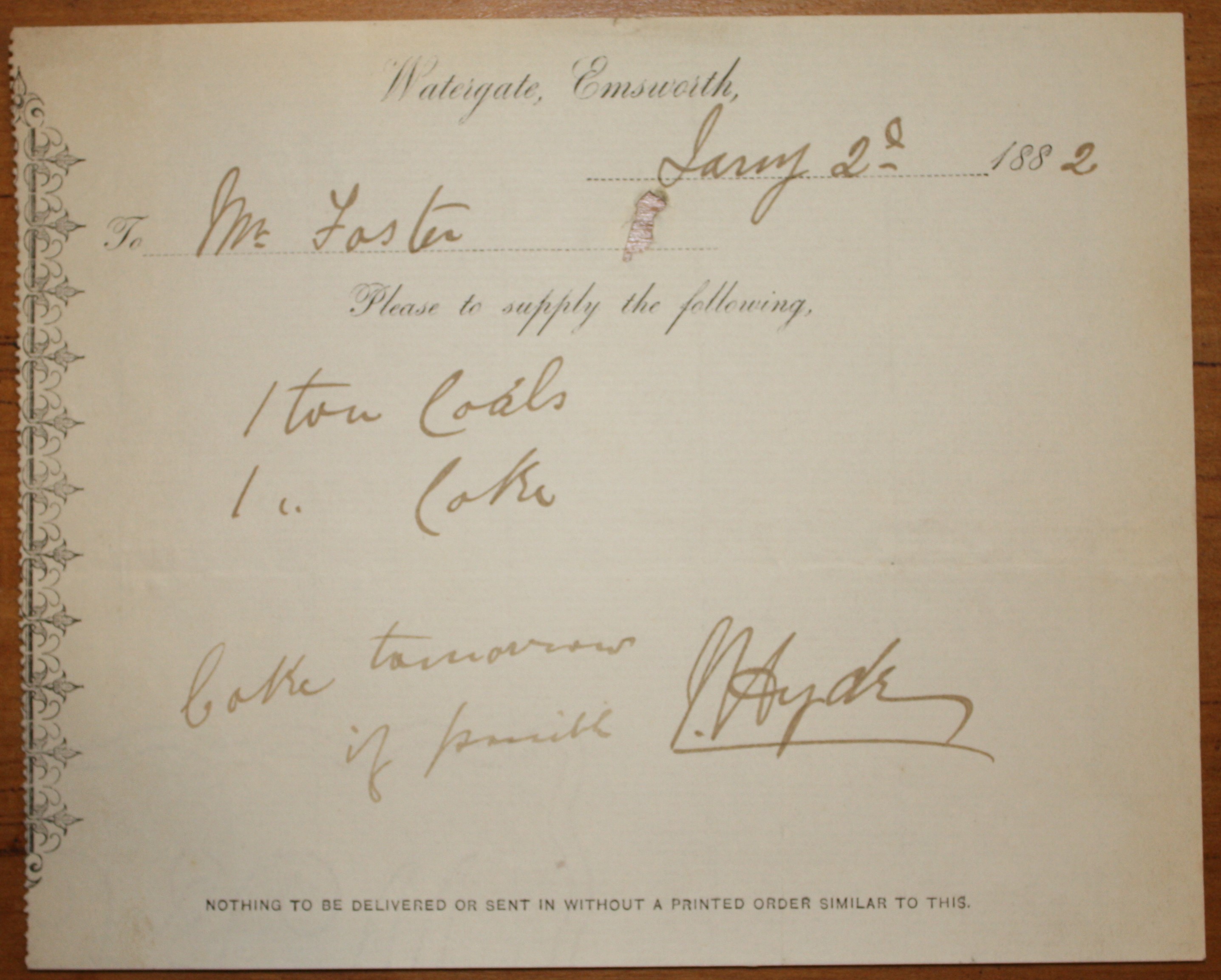 Order for supply to Watergate, Emsworth.