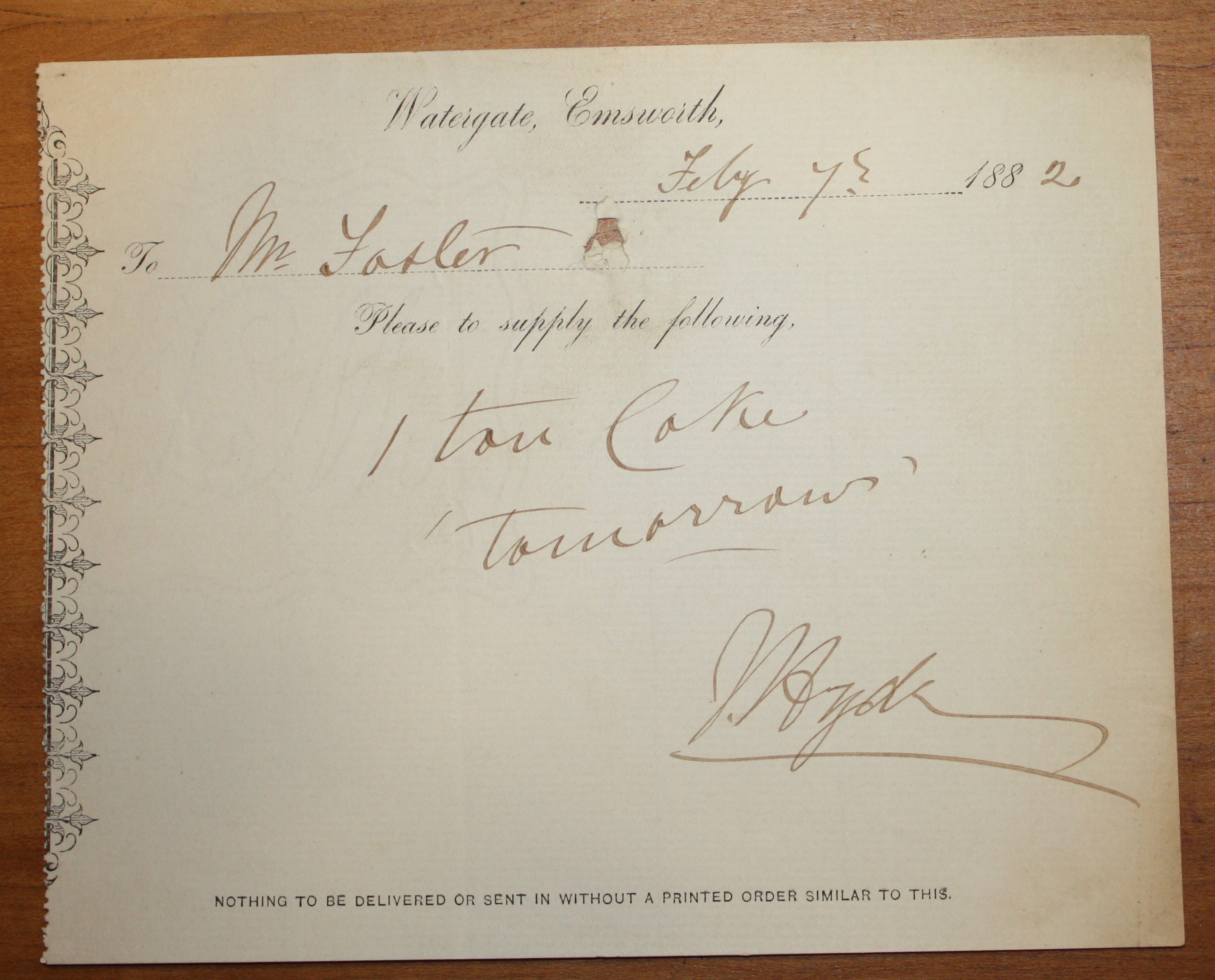 Watergate, Emsworth, “Order for supply to Watergate, Emsworth.,” Emsworth Museum, accessed April 25, 2026, https://emsworthmuseum.org.uk/emcms/items/show/2859.