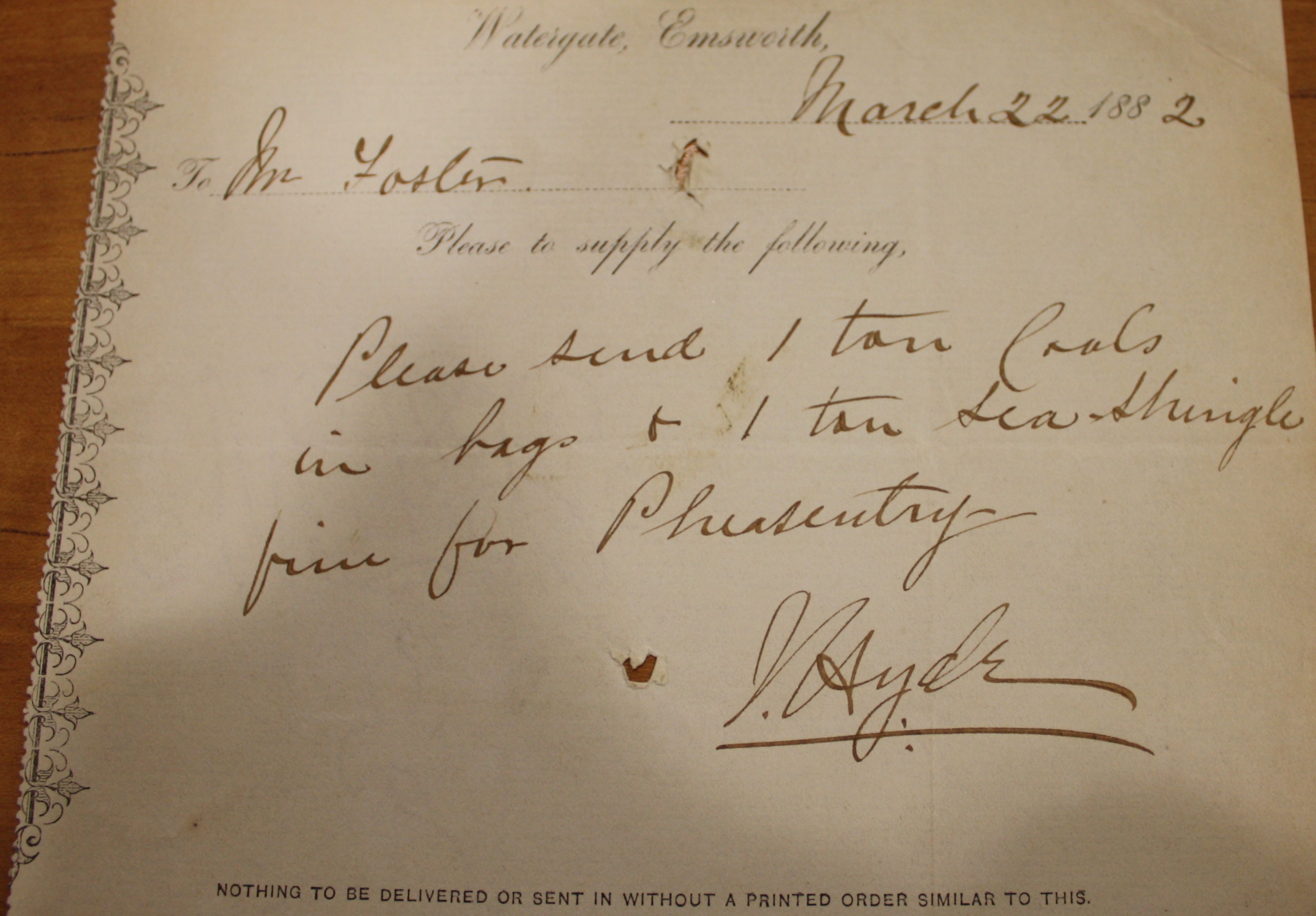 Accounts dated 1871-83 to Wm Foster from Watergate, Emsworth Family papers relating to the estate of Margaret Foster Accounts, receipts taxes etc of Wm Foster 1883-1884 from local (Uppark, Stansted, Petworth) firms and residents etc - covering timber and coal including several ship names Order slip for supplies. White paper with decoration along the left-hand vertical edge. Partly printed with 'Watergate, Emsworth', '188', 'To', 'Please to supply the following', 'Nothing to be delivered or sent in without a printed order similar to this'. 16 cm x 13 cm. Two puncture holes probably from an office spike.