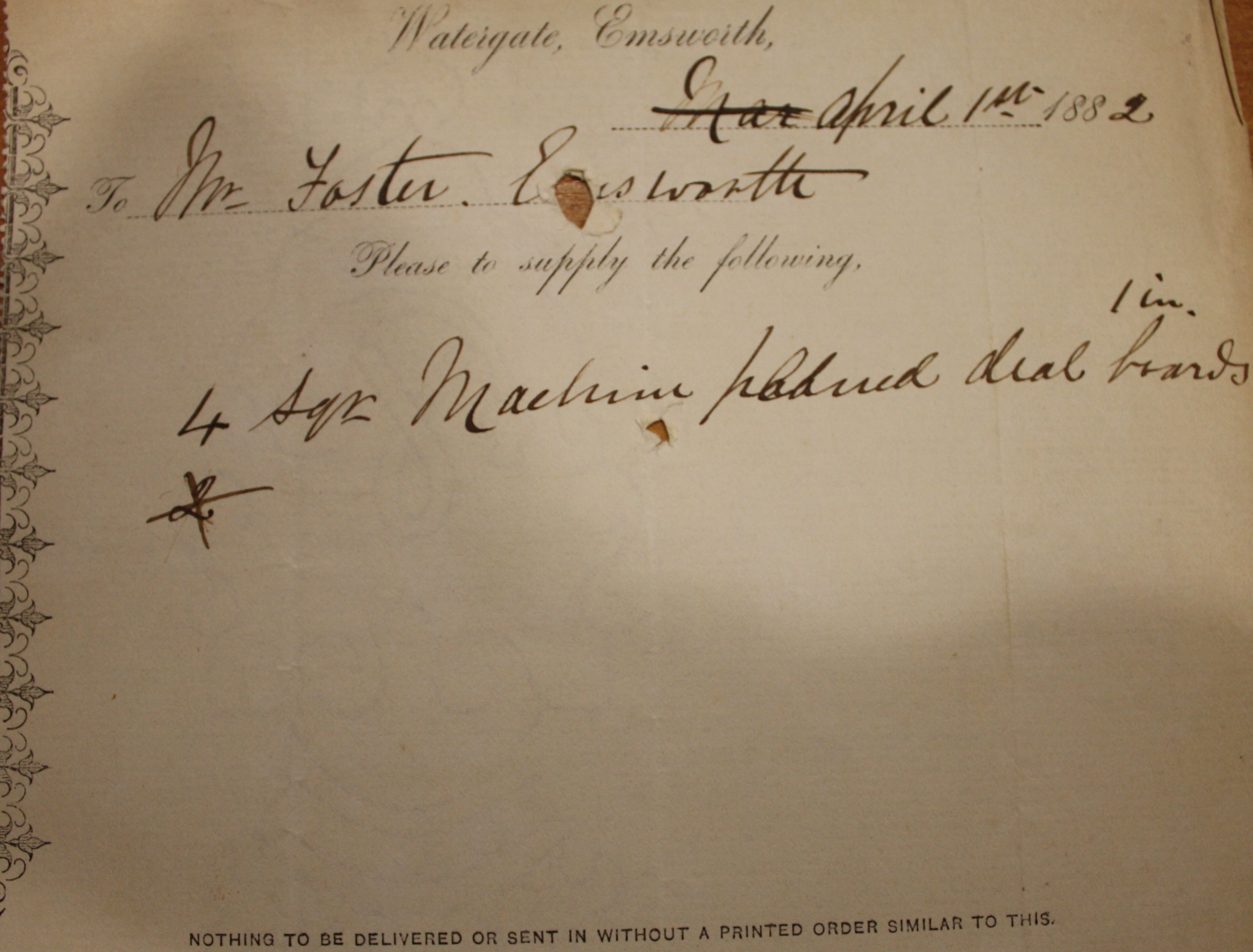 Accounts dated 1871-83 to Wm Foster from Watergate, Emsworth Family papers relating to the estate of Margaret Foster Accounts, receipts taxes etc of Wm Foster 1883-1884 from local (Uppark, Stansted, Petworth) firms and residents etc - covering timber and coal including several ship names. Order slip for supplies. White paper with decoration along the left-hand vertical edge. Partly printed with 'Watergate, Emsworth', '188', 'To', 'Please to supply the following', 'Nothing to be delivered or sent in without a printed order similar to this'. 16 cm x 13 cm. One puncture hole probably from an office spike.