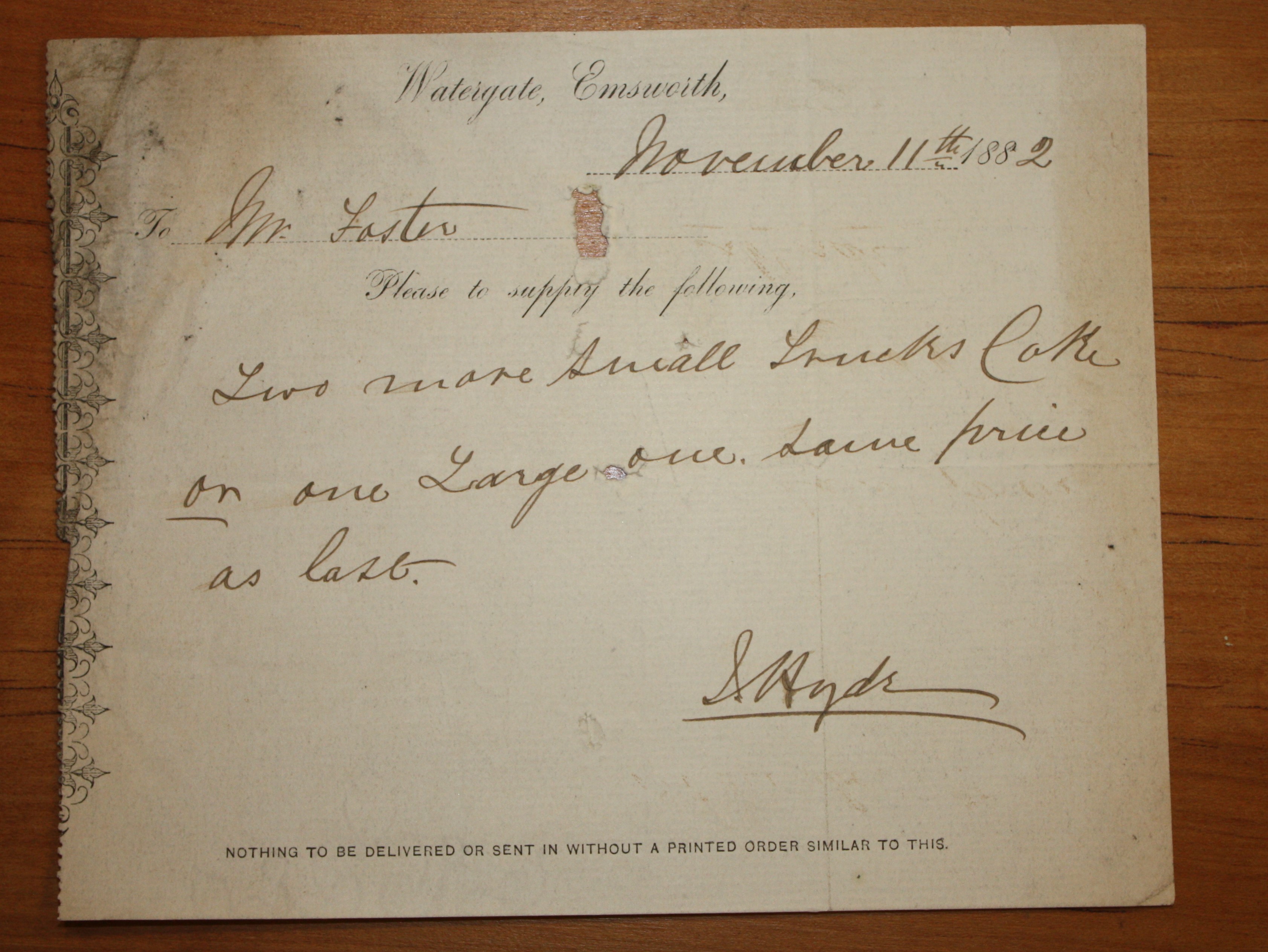 Order for supply to Watergate, Emsworth.