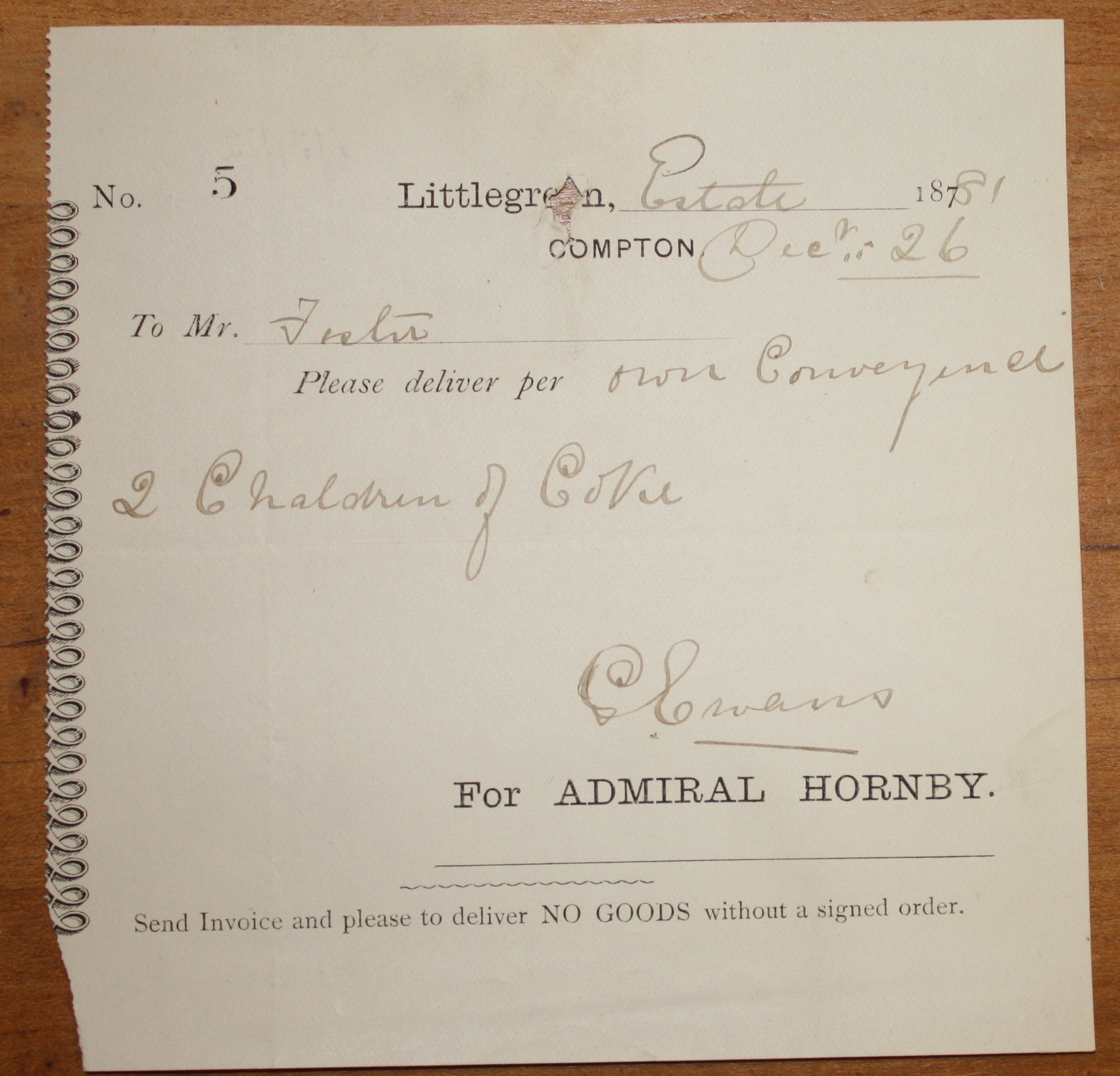 Littlegreen Estate, Compton , “Order for supply to Littlegreen Estate, Compton.,” Emsworth Museum, accessed April 25, 2026, https://emsworthmuseum.org.uk/emcms/items/show/2876.