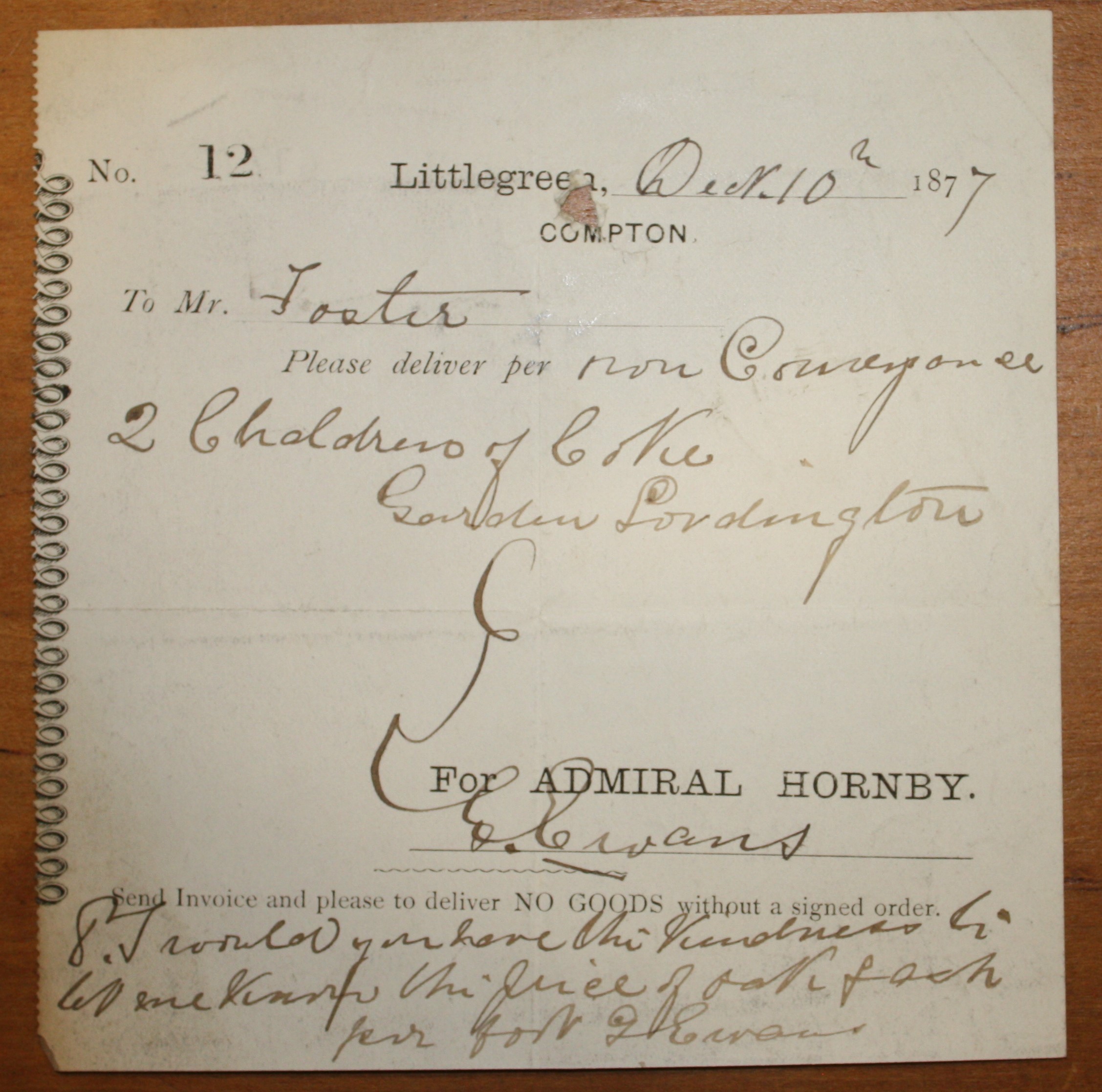Littlegreen, Compton , “Order for supply to Littlegreen Estate, Compton.,” Emsworth Museum, accessed April 25, 2026, https://emsworthmuseum.org.uk/emcms/items/show/2878.