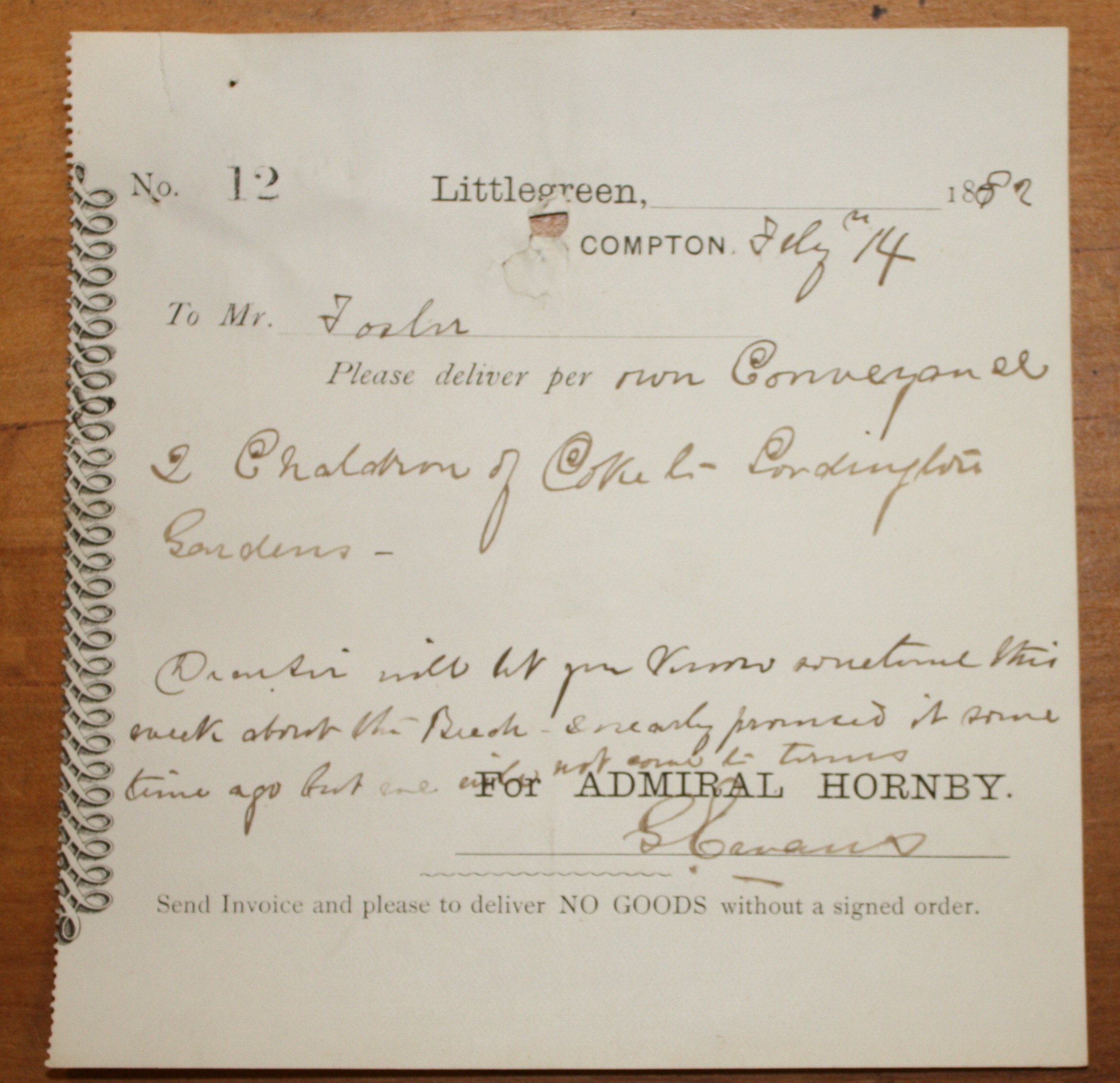 Littlegreen, Compton , “Order for supply to Littlegreen Estate, Compton.,” Emsworth Museum, accessed April 25, 2026, https://emsworthmuseum.org.uk/emcms/items/show/2879.