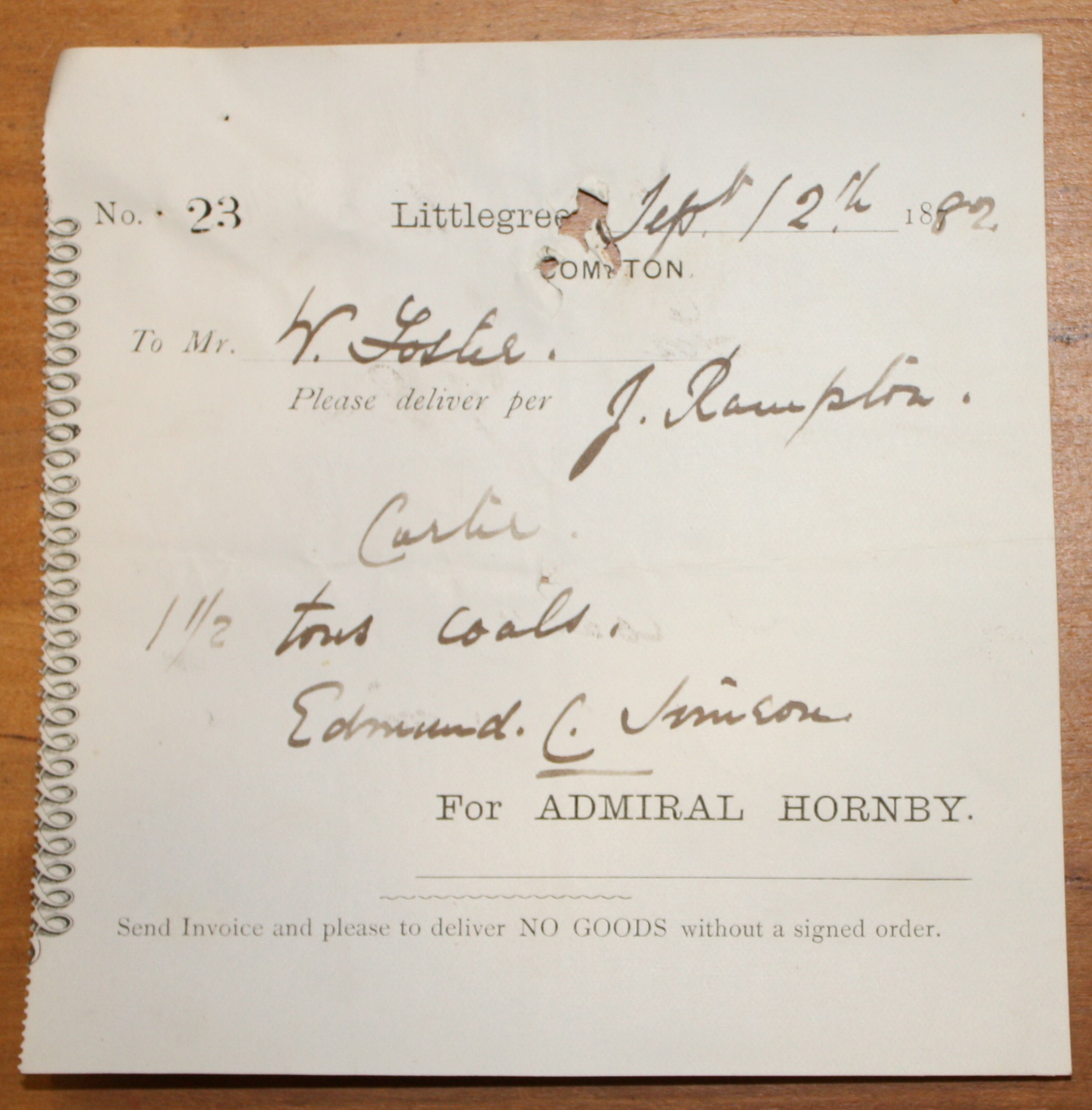 Littlegreen, Compton, “Order for supply to Littlegreen Estate, Compton.,” Emsworth Museum, accessed April 17, 2026, https://emsworthmuseum.org.uk/emcms/items/show/2887.