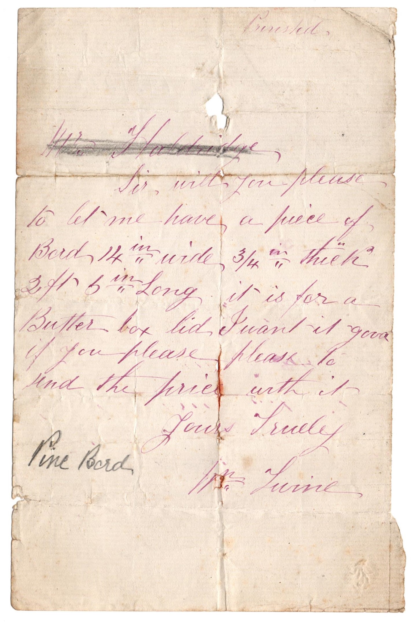 Letter from William Twine. 17.5cm x 11cm. Fair condition- fold lines, tear in centre and puncture in top, probably from office spike.