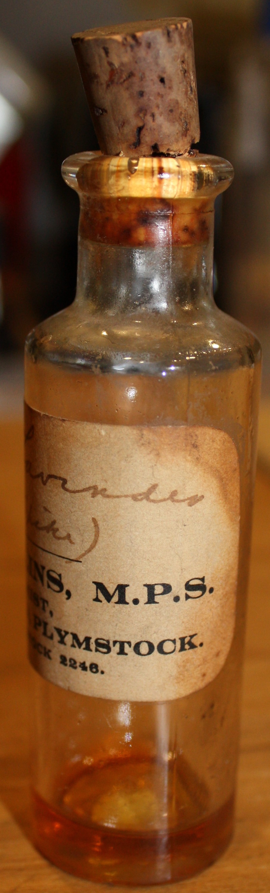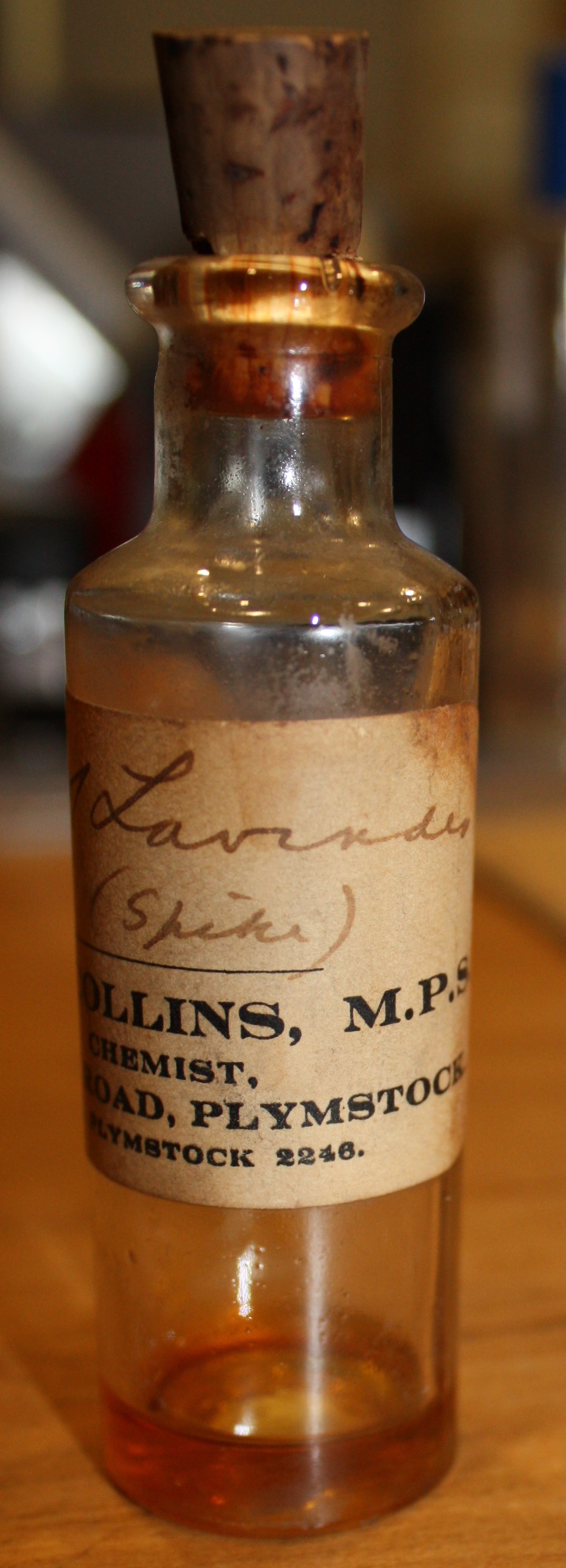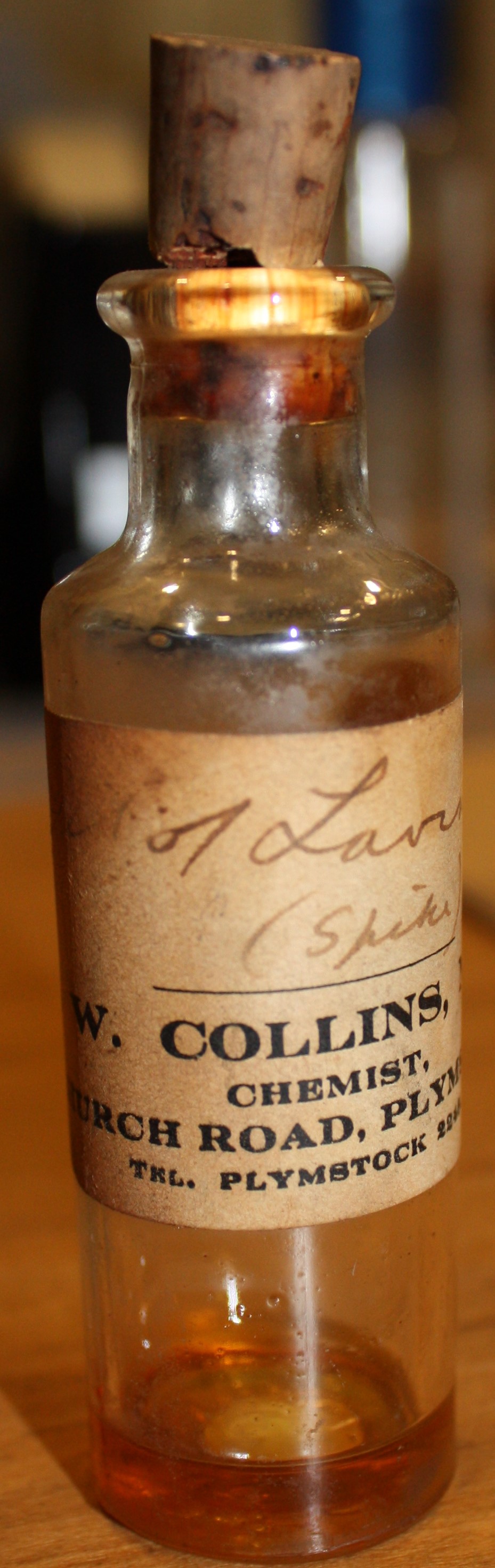 Bottle for Oil of Lavender. Glass jar with cork. 10.5 cm high. Good condition. Some mixture left in bottom. Paper label. Printed: C. W. Collins, M.P.S Chemist. Church Road, Plymstock. Tel. Plymstock 2246. Handwritten above -Oil of Lavender (Spike). 1940 (circa)