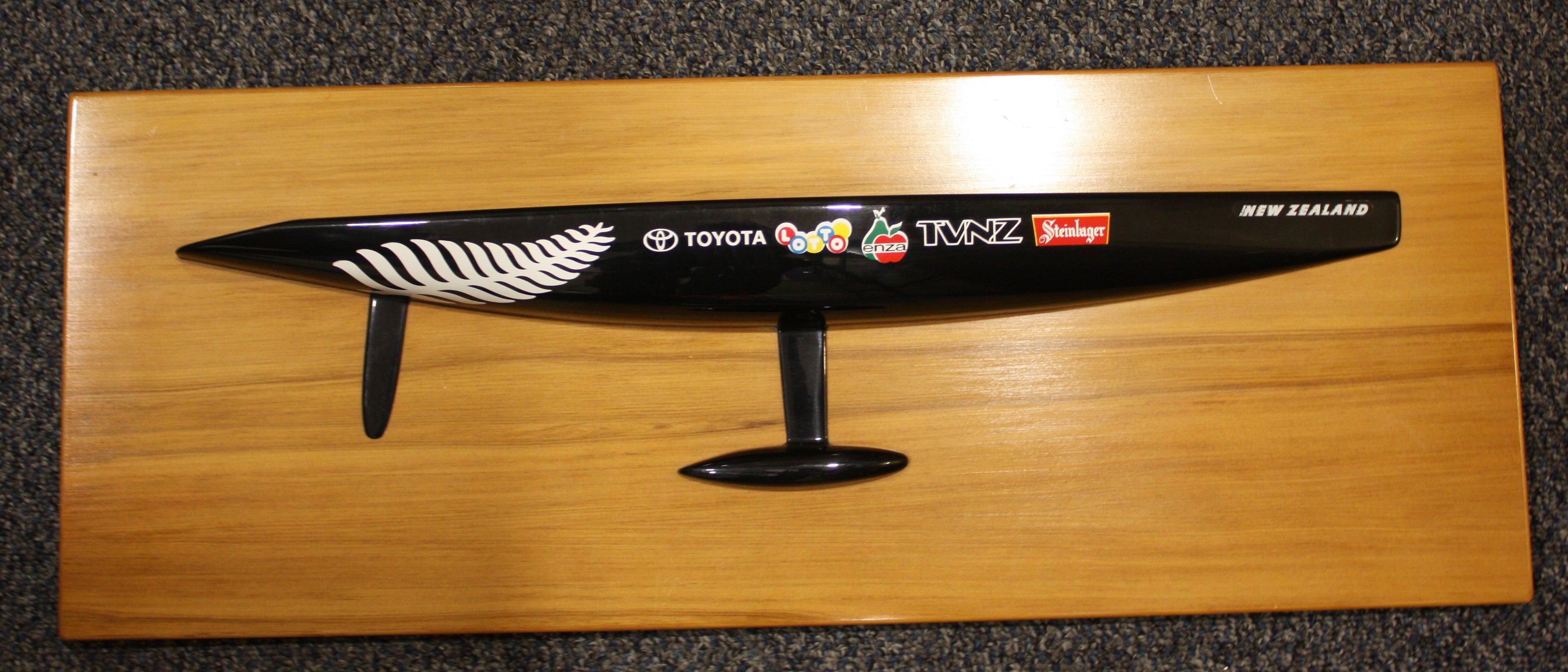 Half ship model of 'Black Magic', sailed by Peter Blake in 1995 Americas cup. Mounted on wooden board, 60cmx23cm.