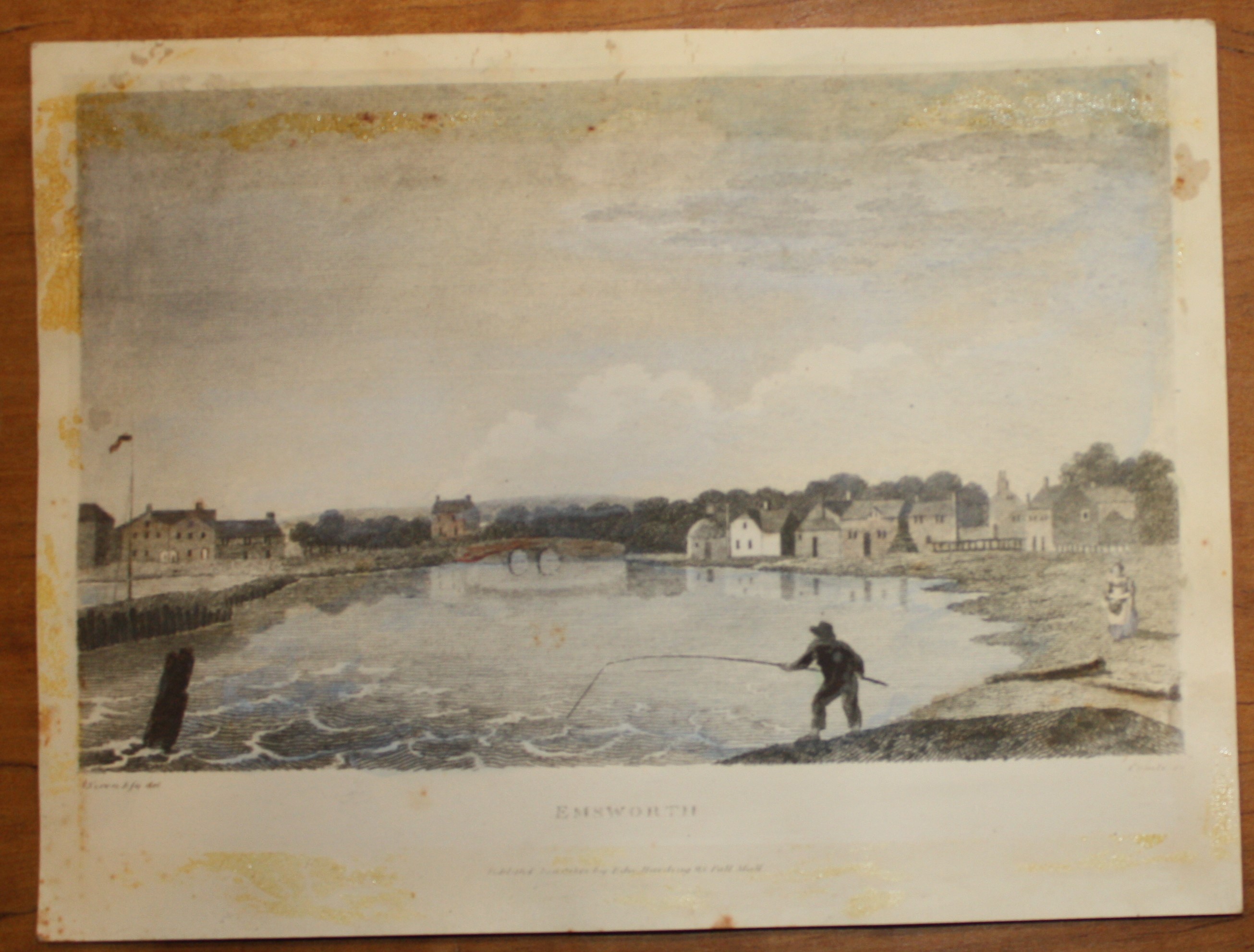 Print 'Emsworth.' 18cm x 24cm. Very poor condition- previous attachment to frame has left significant yellow glue marks along edges, including along top of picture.