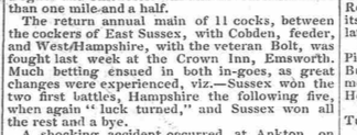 Newspaper report of cock fight competition between West Sussex and Hampshire at the Crown Inn. West Sussex won!